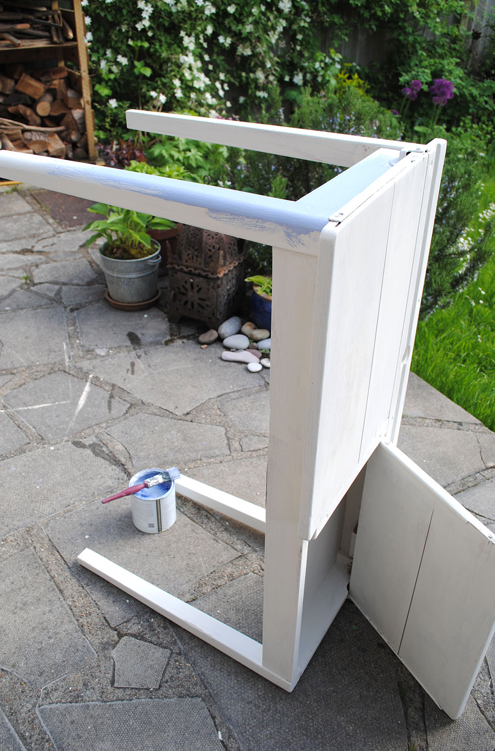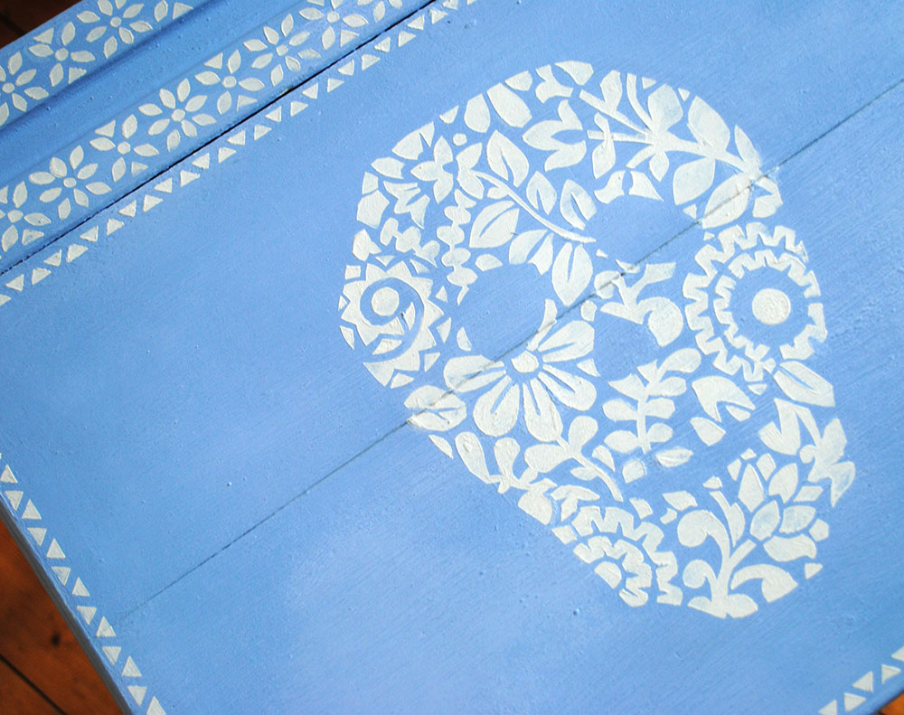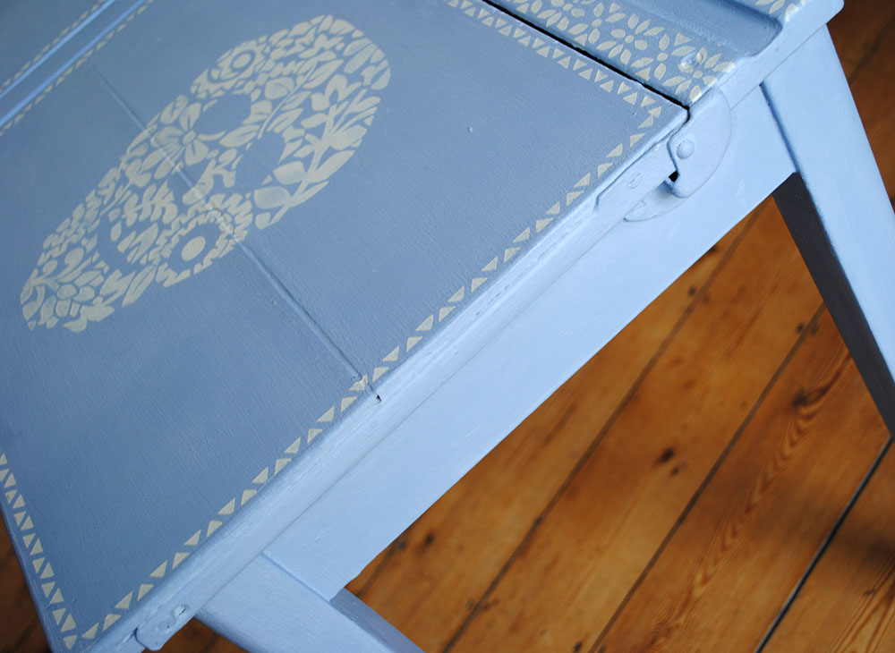 I painted a coat of Annie Sloan’s Old White Chalk Paint to begin with followed by Louis Blue. A while ago I printed some T-shirts with a skull design which were really sweet and so I recreated my design as a stencil. I applied the skull and pattern with Old White and then applied several coats of clear wax