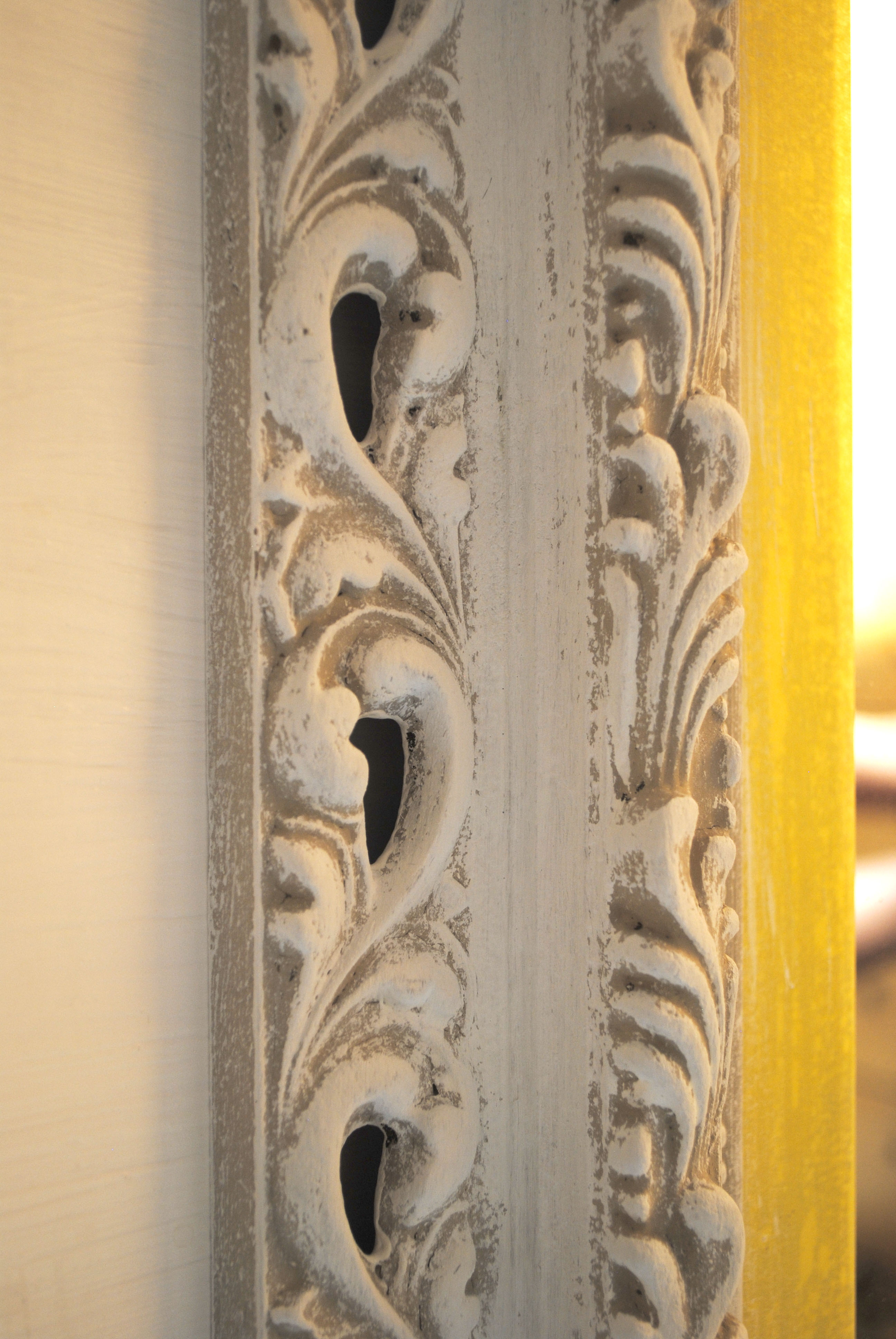 I painted over the dull gilt frame with a coat of Annie Sloan’s Country Grey Chalk paint. Using a hog hair bristle brush, I then added a layer of Pure , but I applied it in a very rough, dry brush technique, so that lots of the Country Grey still shows through. The trick here is not to be too uniform in the application. Some areas have more of the white paint than others, leaving more of the Country Grey showing through in other areas. This creates a gorgeous faded, distressed effect. I haven’t waxed this piece because it will receive very little handling and so doesn’t need the protection of the wax. The finish is a lovely matt, chalky texture, just like it says on the tin!