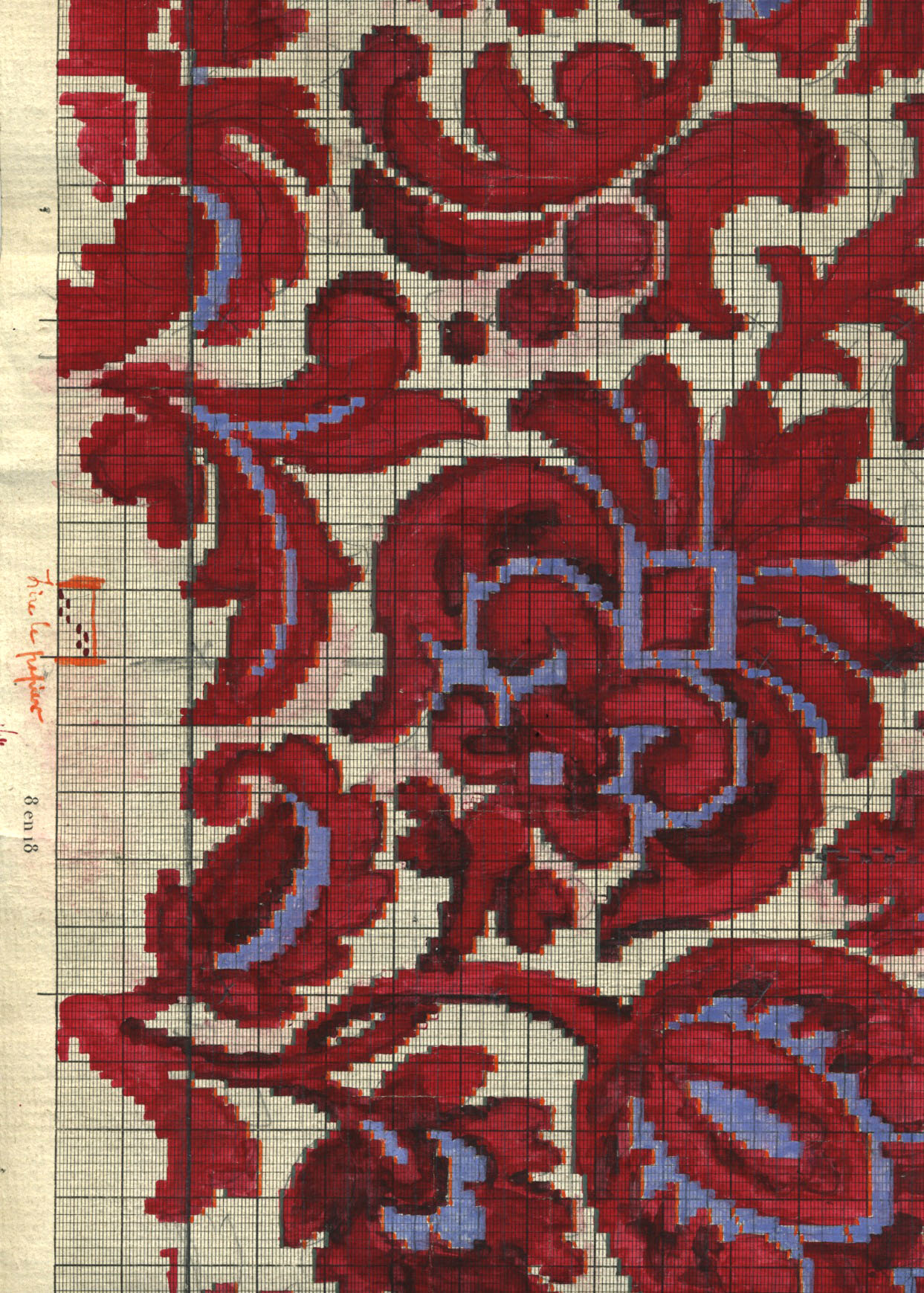 I bought a selection of original French designs probably for silk brocade or jacquard weaves. Each design had been painstakingly painted with gouache onto graph paper and each one is in perfect repeat. The backs of them have the most beautiful hand written notes.