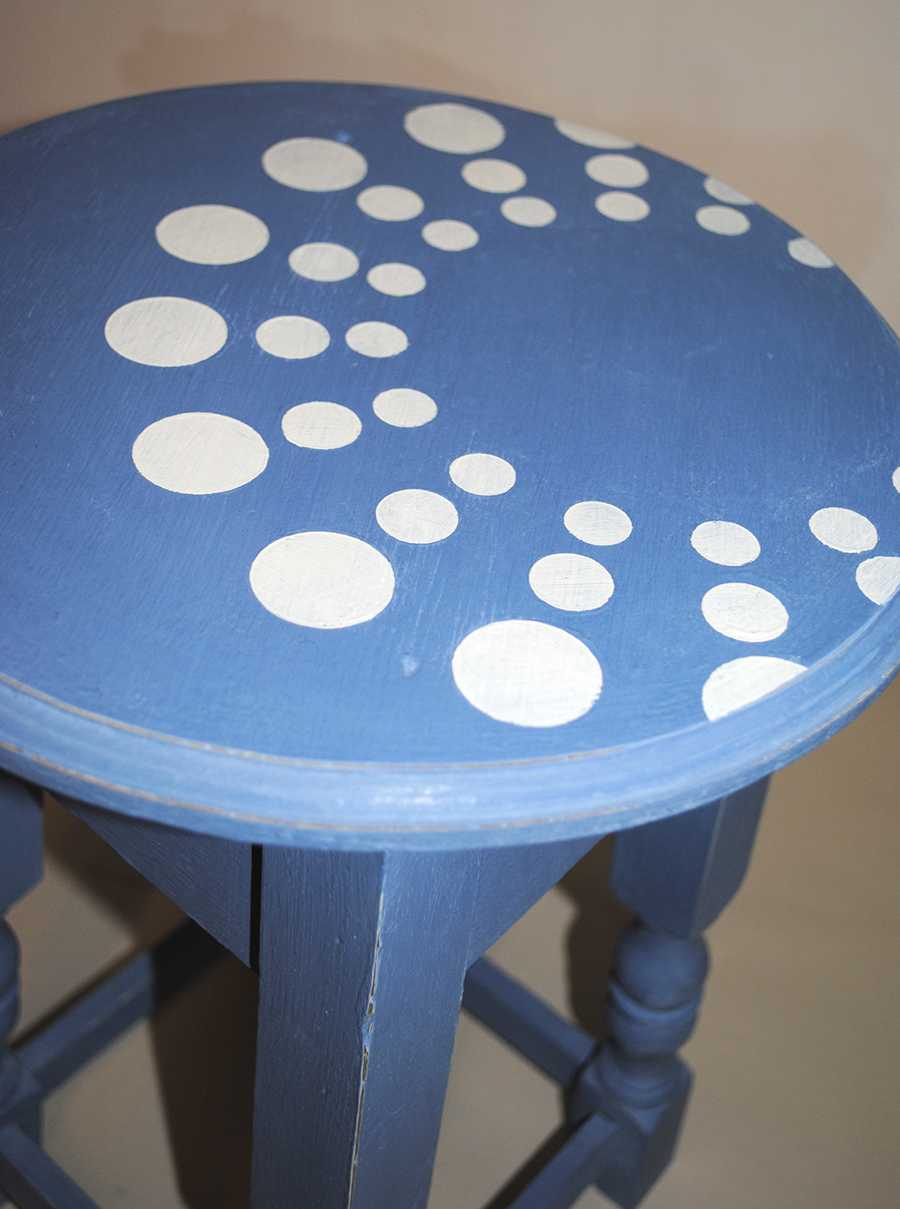 I painted it in Old Ochre chalk paint by Annie Sloan and then gave it a top coat of Greek Blue. Using Old White, I added the pattern using my Lodi Stencil, but I positioned it off center and left out the central motif. After waxing using the clear wax, I sanded it at the edges to reveal a little of the colour underneath and some of the wood.