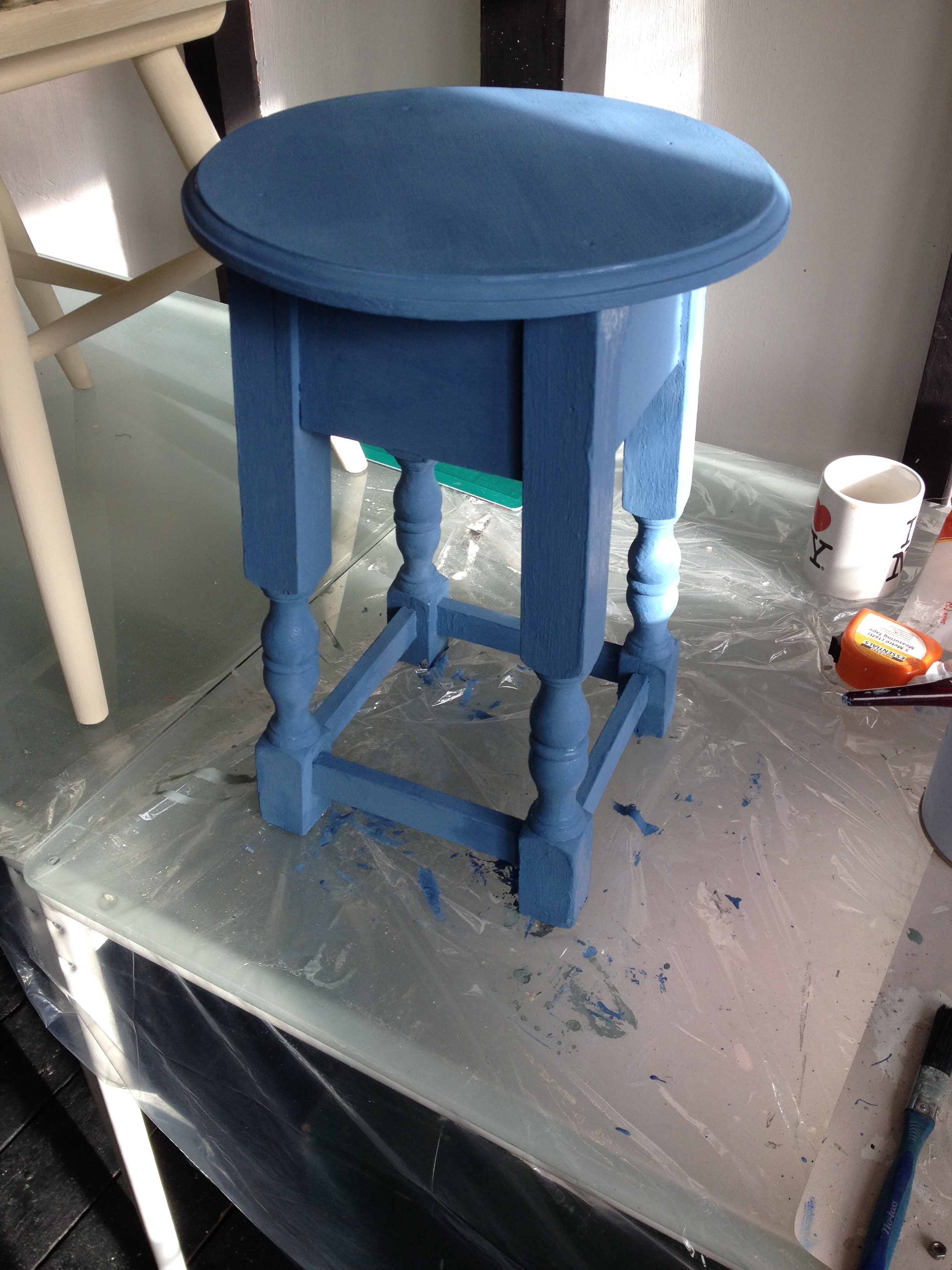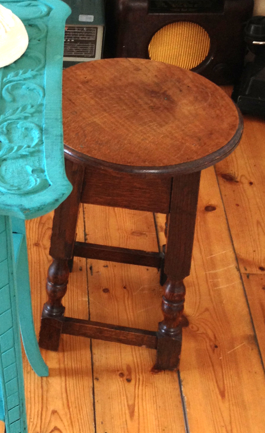 This little stool is has been in my shop behind my desk and as I have already painted everything else which is in the shop, it was time to paint the stool. It is a really solid heavy wooden stool, but covered in a horrid shiny brown varnish.