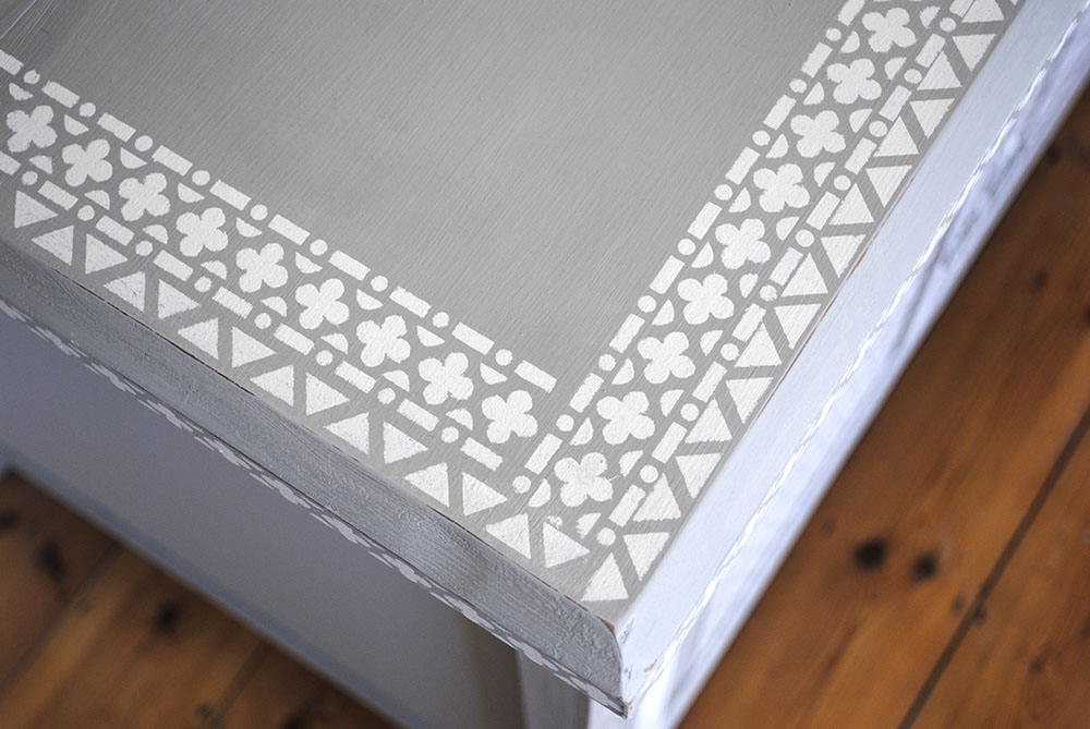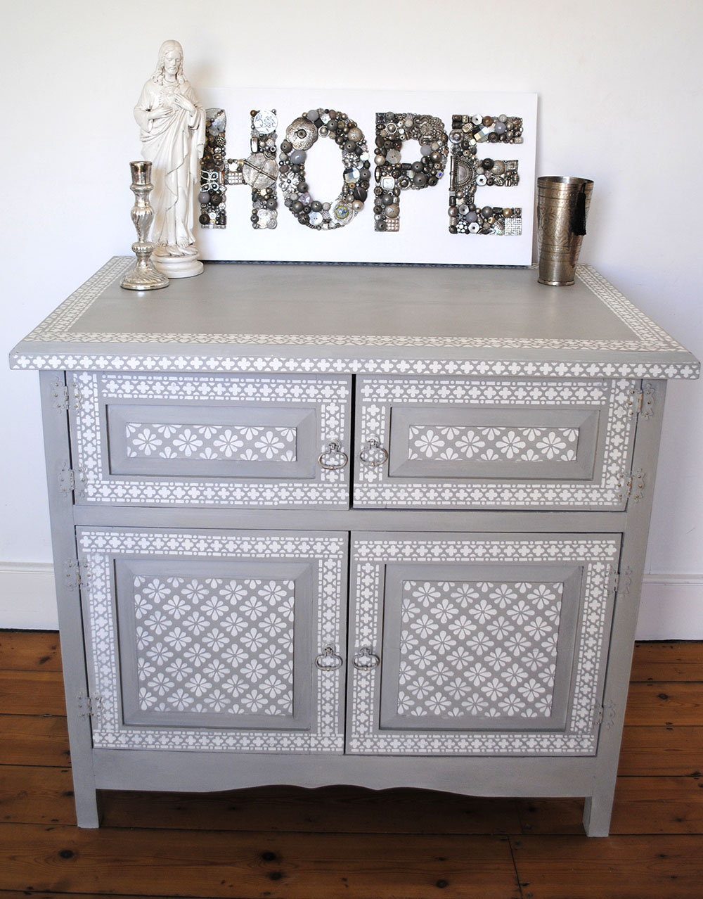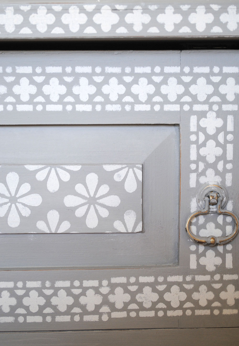 To begin with, I painted two coats of Annie Sloan Chalk Paint in Paris Grey and then set to work stencilling the pattern using Old White. I used two of my new stencils, starting with the Neemrana Border Stencil around the doors and the top and then the Agra Stencil to create the pattern on the door panels. After applying two coats of clear wax I sanded the corners and hardware very gently using a fine grade sandpaper. I have to be honest, I am pretty pleased with this one!