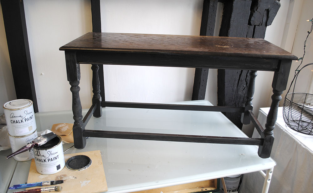 After painting it with Annie Sloan Chalk Paint in Graphite, I stencilled a border around the top and along the legs with the Rajasthan Border stencil using Country Grey.