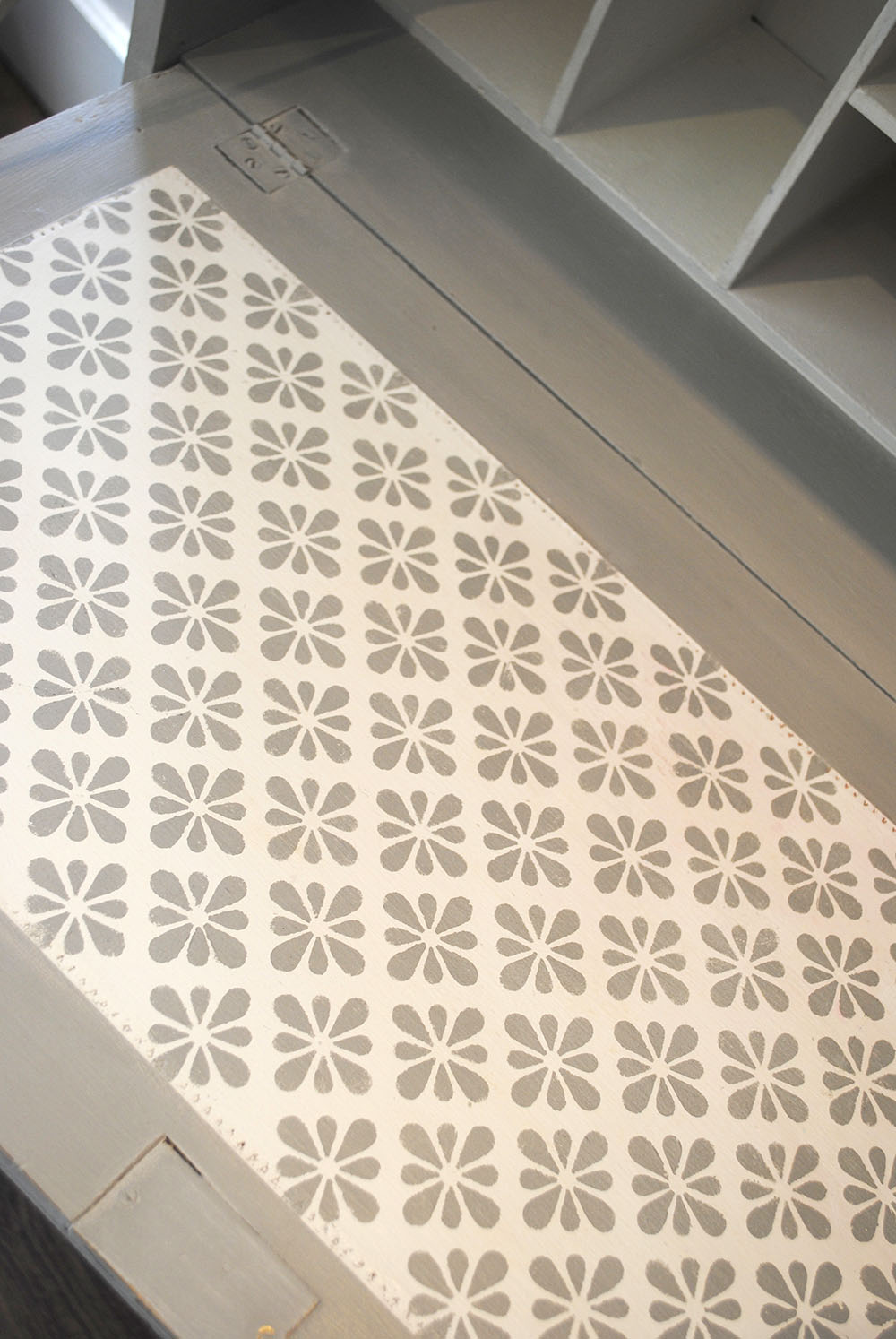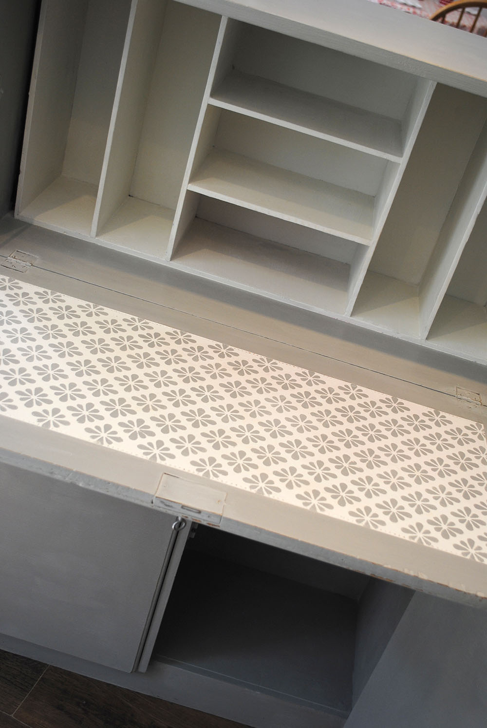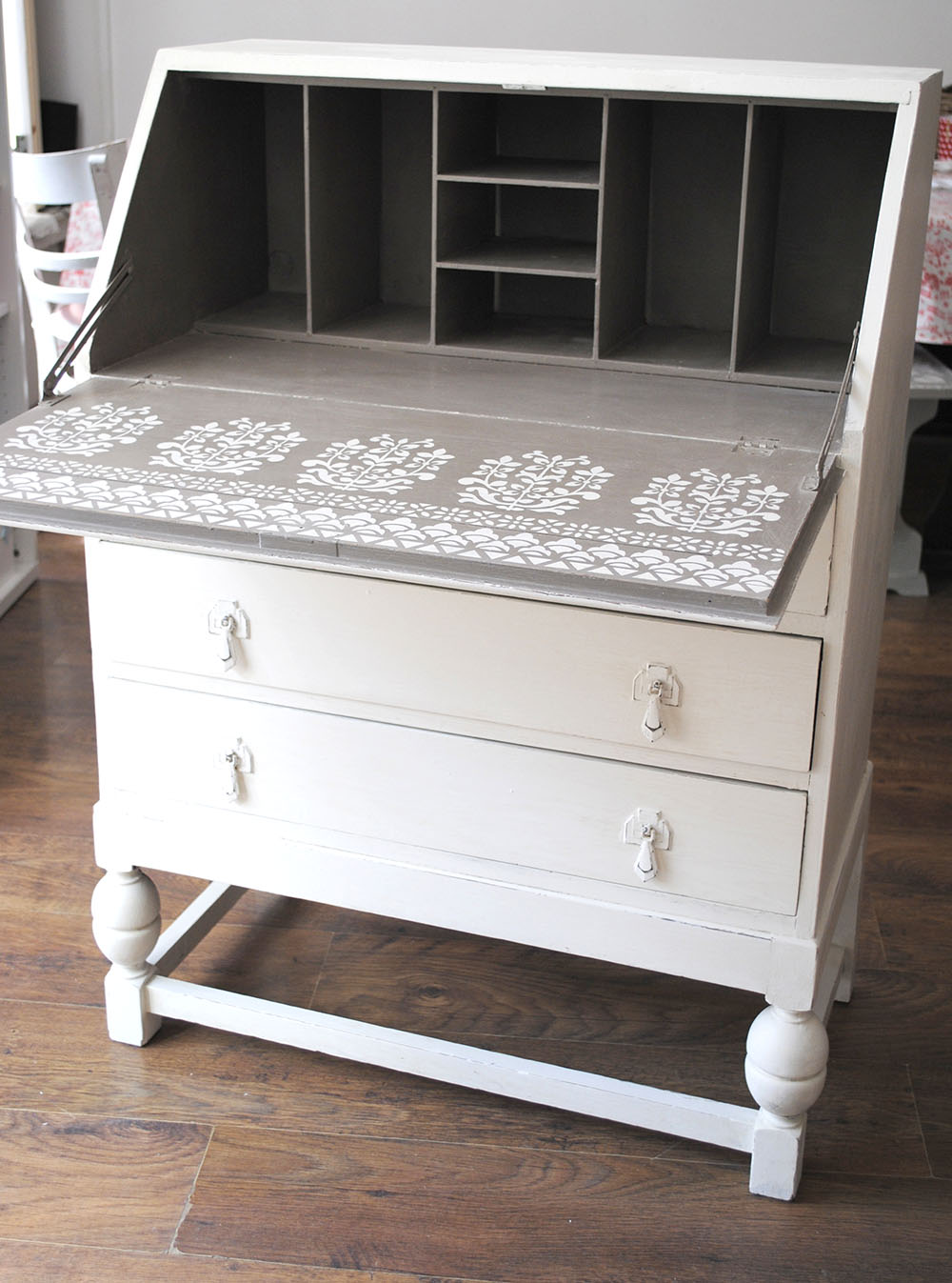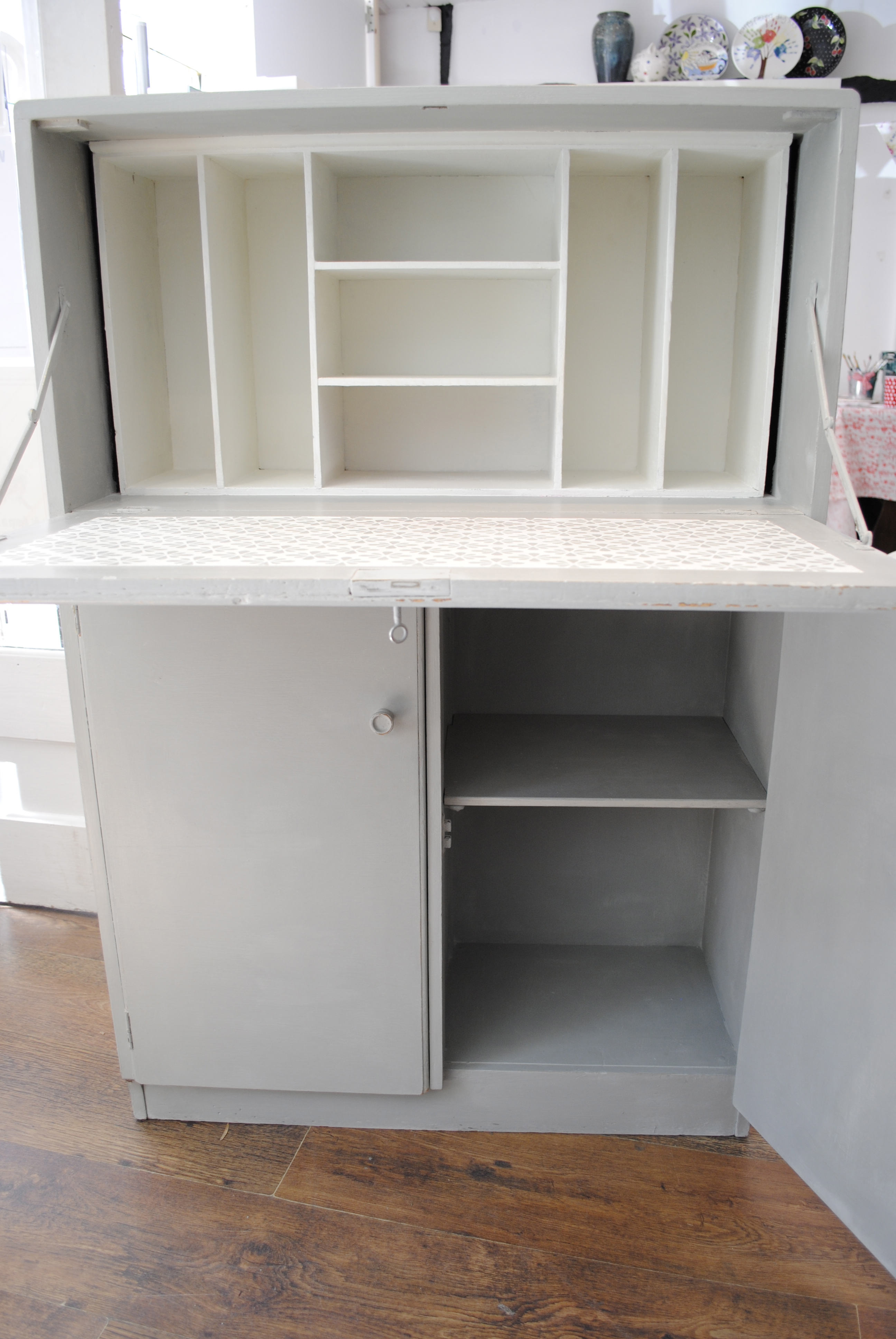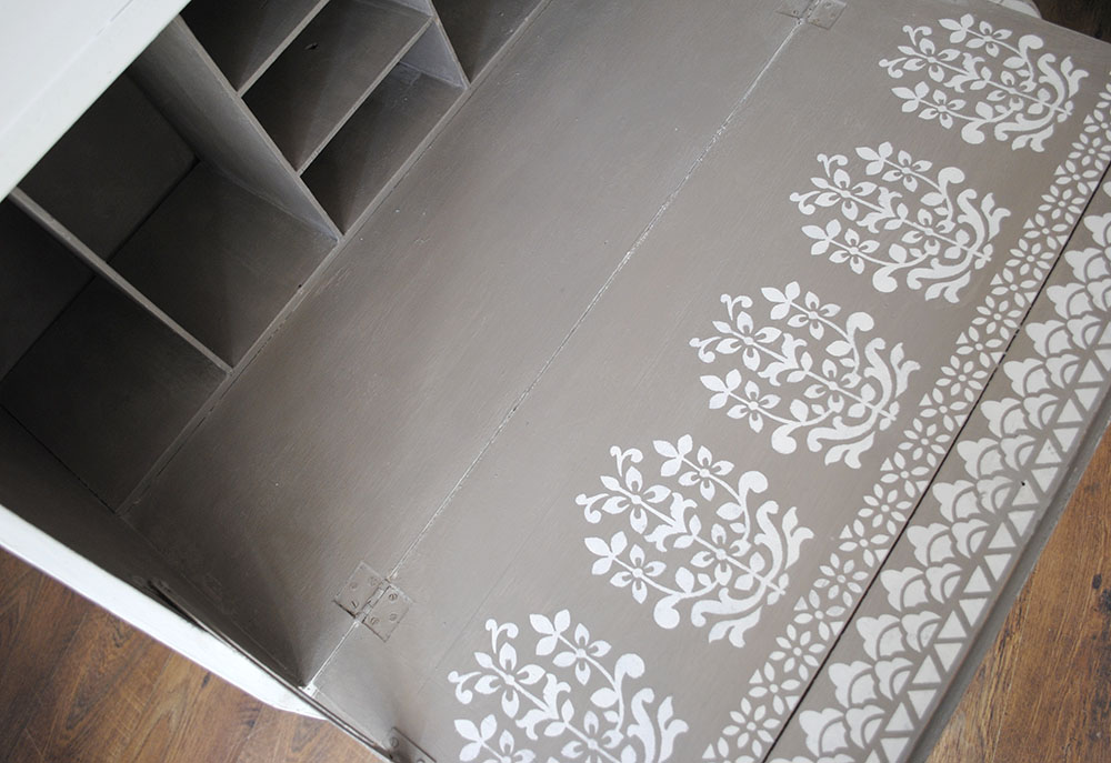 Here are a couple of pieces I bought from a second hand furniture shop recently. Both looked very tired, but both are very well made and importantly are very useful pieces of furniture. I painted and distressed the exteriors and then added a selection of my stencils to the pull down desk tops. Both pieces took center stage in the shop window for a few weeks. Last week they both sold to different people within a day of each other.