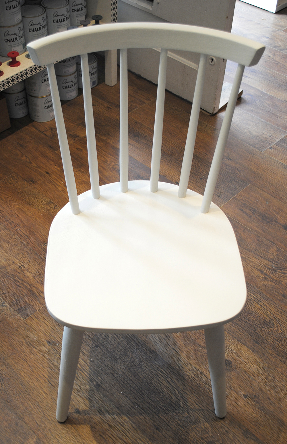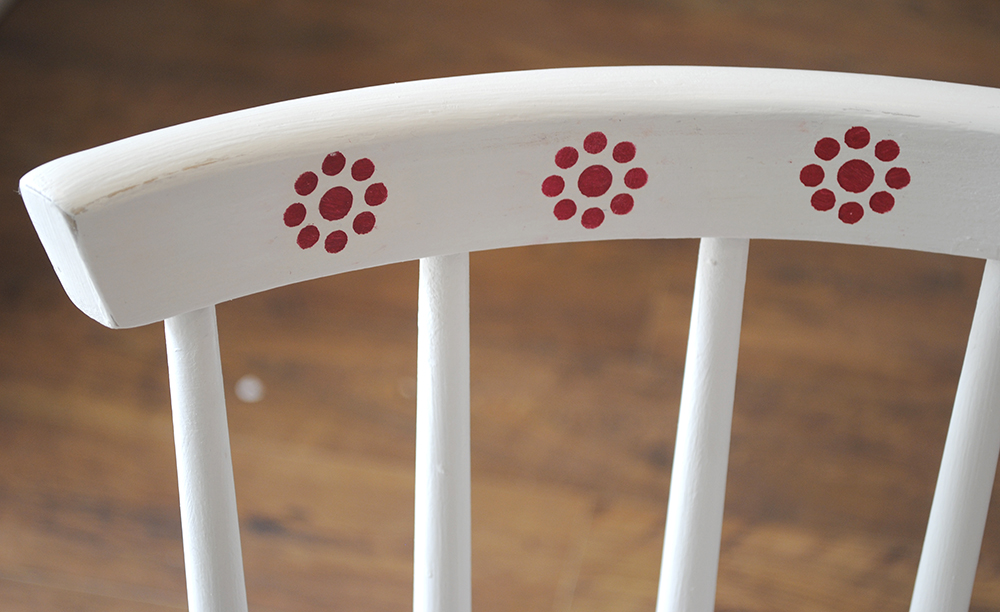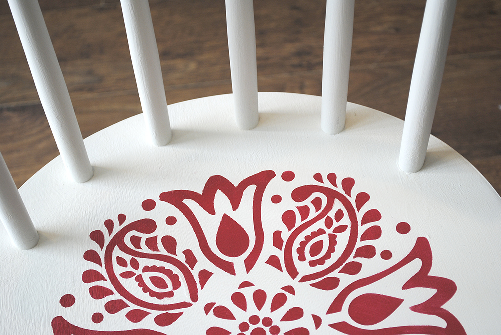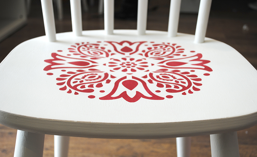I had another of the chairs already painted with Annie Sloan Chalk Paint™ in Old White and waiting for the stencil design to be added. I keep meaning to do a tasteful, neutral chair, but for some reason I feel compelled to use the bright colours on the chairs.