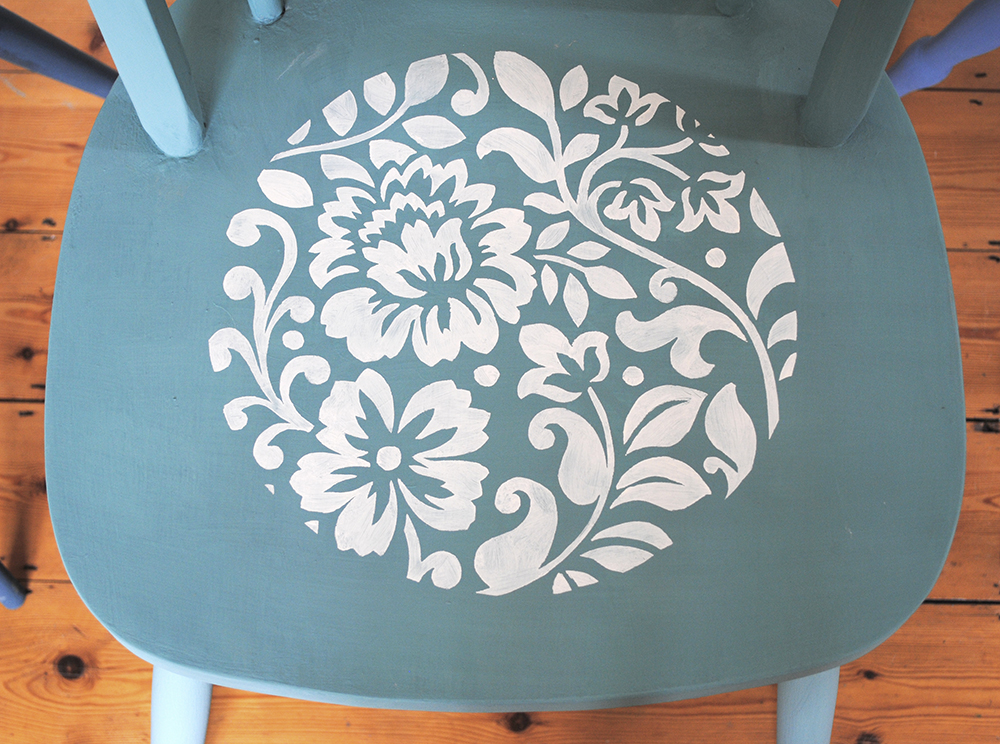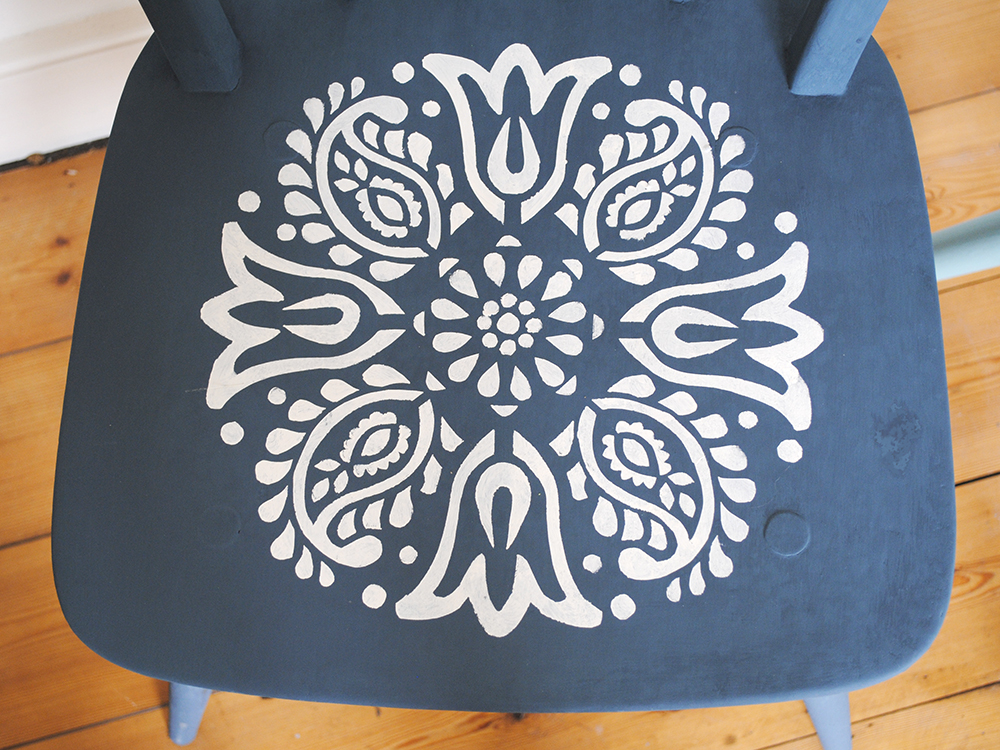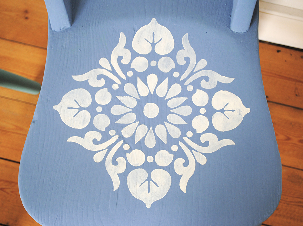 I used the Janpath, Jodhpur and Kota stencils which work well together as they are all the same size. The stencil designs were painted with Original which is a lovely soft creamy white. You could also reverse the colour and paint the chair in Original with a coloured stencil on top. I suppose that really the point with mismatching is that the rules don’t really apply, you can do what you want!