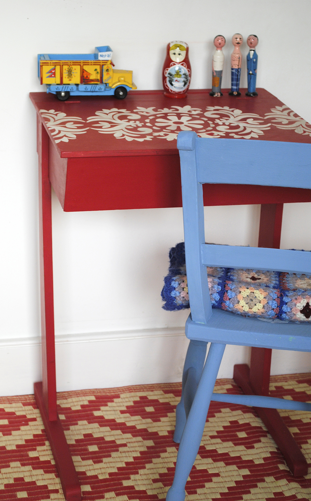 There is definitely a case for not painting some pieces, but this one was in a bit of a state. I deliberated over what colour to paint it and for reasons which I am not completely clear about, I decided to go with a folky feel and so it had to be red, Annie Sloan Chalk Paint™ in Emperor’s Silk to be precise.