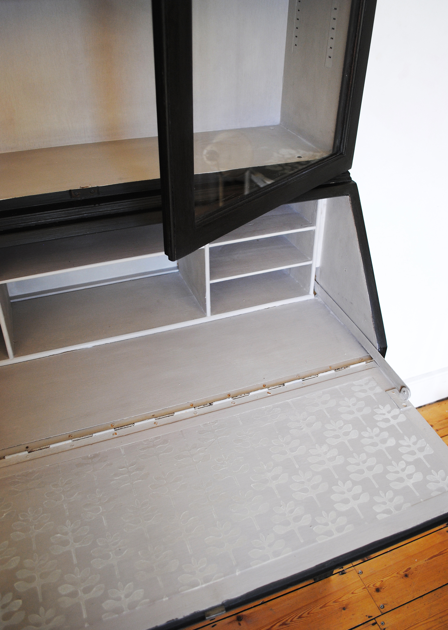 It was painted with a shiny Mahogany coloured varnish and I knew immediately I wanted to paint it a really deep Graphite colour. I gave it a coat of slightly watered down paint on the exterior and mixed a greyed off neutral for the interior. Initially my plan was to stencil the desk top in the dark Graphite colour for a really graphic contrast, but at the last minute I decided to take a more subtle approach, using a soft pearlised white stencil paint instead. I like the fact that from some angles you barely see the stencilling and then when the light catches it you see the soft shimmer of the pattern.