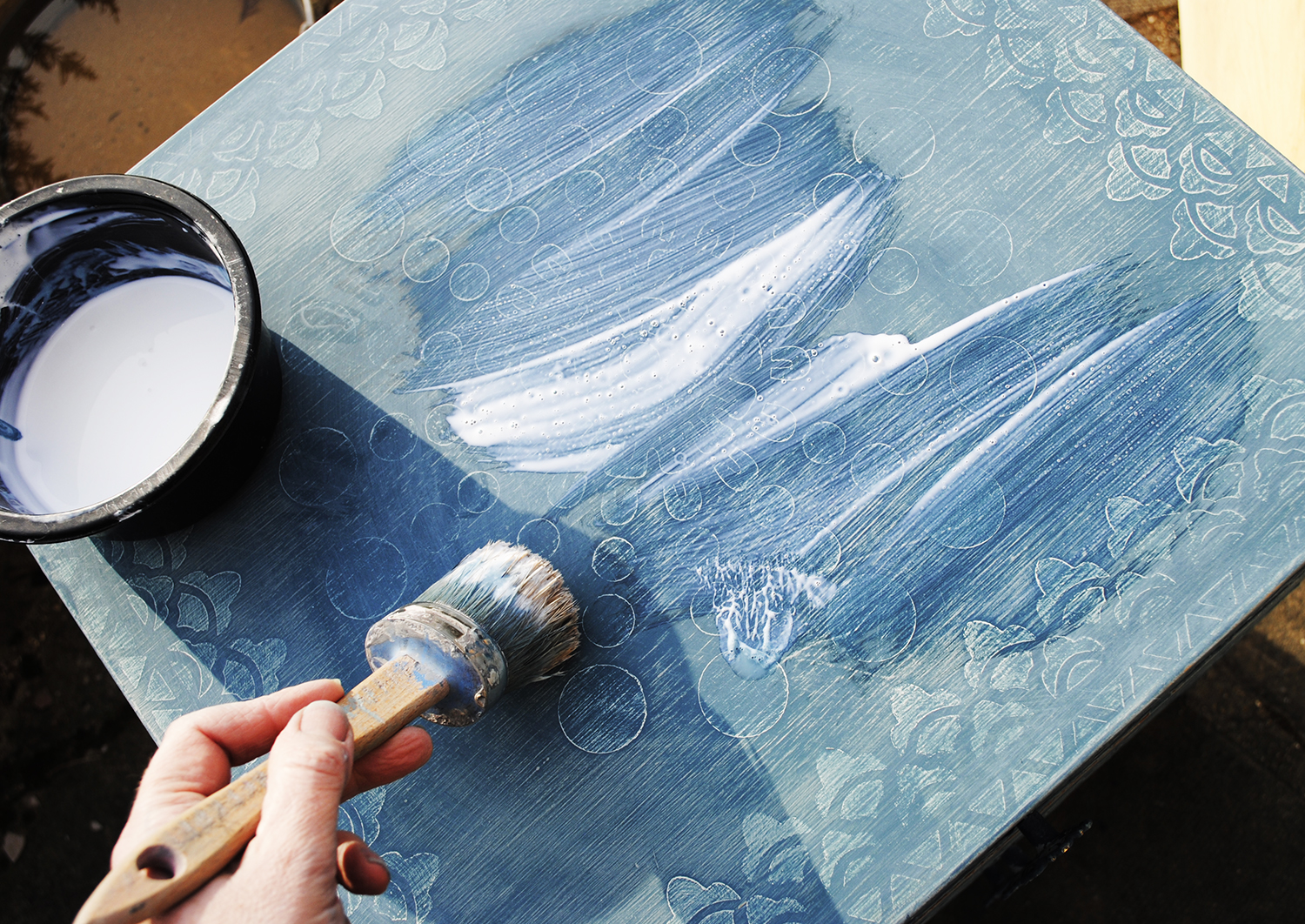 When I bought this pair of bedside cabinets I had planned something quite different to how they turned out in the end. The drawers were stencilled using the Relief Stencil Paste followed by a coat of grey paint and lots of stencilling using the Bukhara and Lodi stencils in white to the tops and sides. In theory that should have been it, but two things happened, one was that I didn’t really like the finished design and the other was that as the cabinets are teak there was quite a lot of bleed through which I hadn’t anticipated and so patches of yellow appeared! I had made a mistake with the design and I had made a mistake in not sealing the wood before painting it.