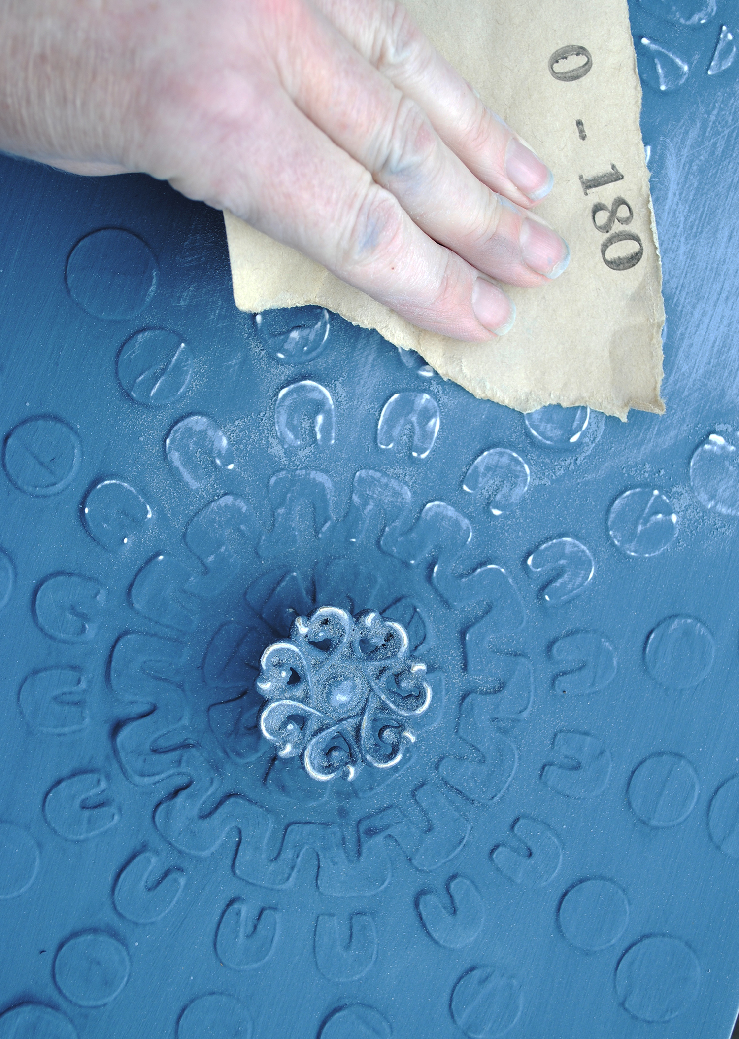 I gave the cabinets a coat of Annie Sloan Chalk Paint™ in Aubusson which is a lovely deep teal colour. All of my stencilling had now disappeared, but once dry I heavily sanded the paint to reveal some of the stencil design beneath. The 3D stencils on the drawers were sanded more gently, just knocking off the paint on the edges.