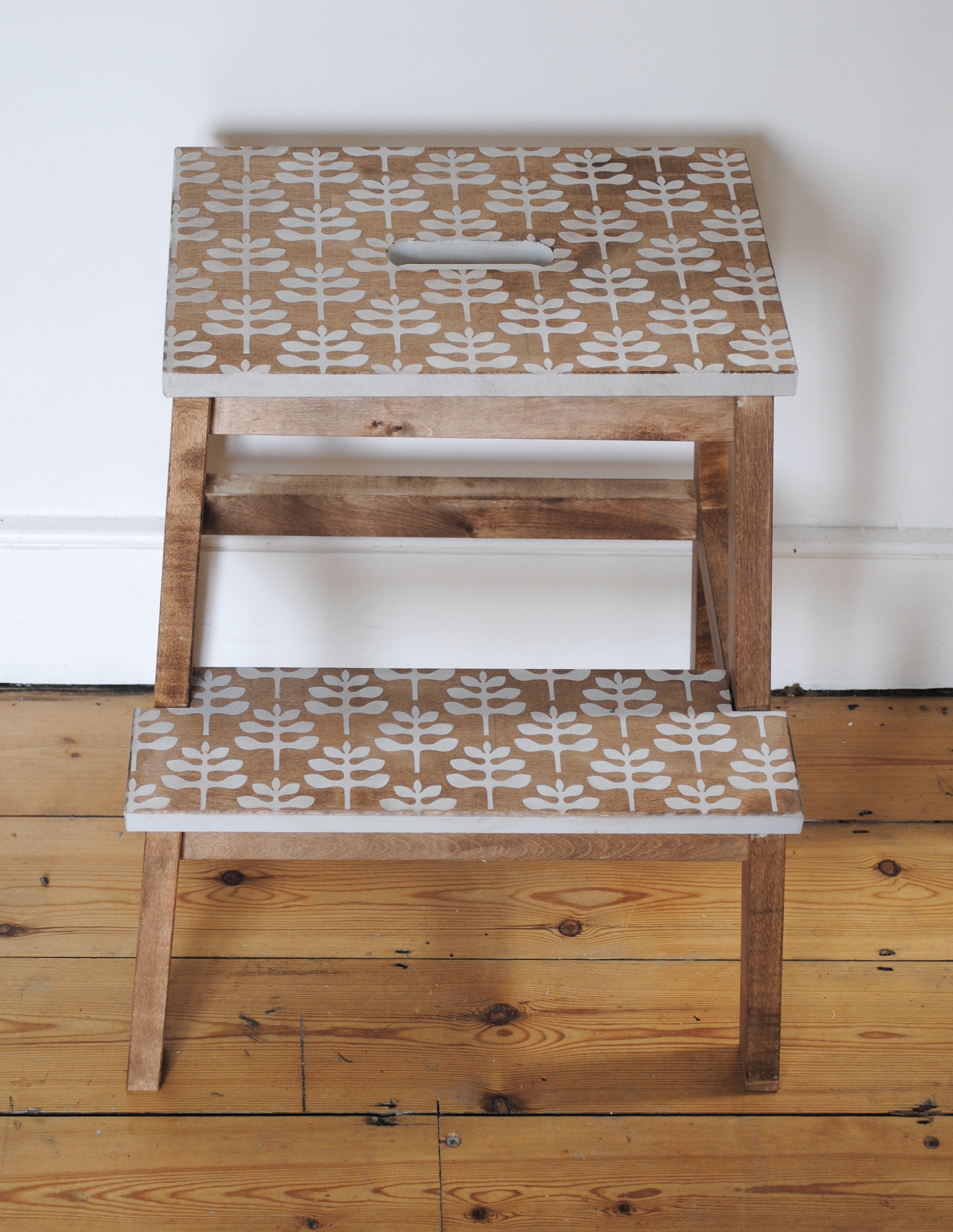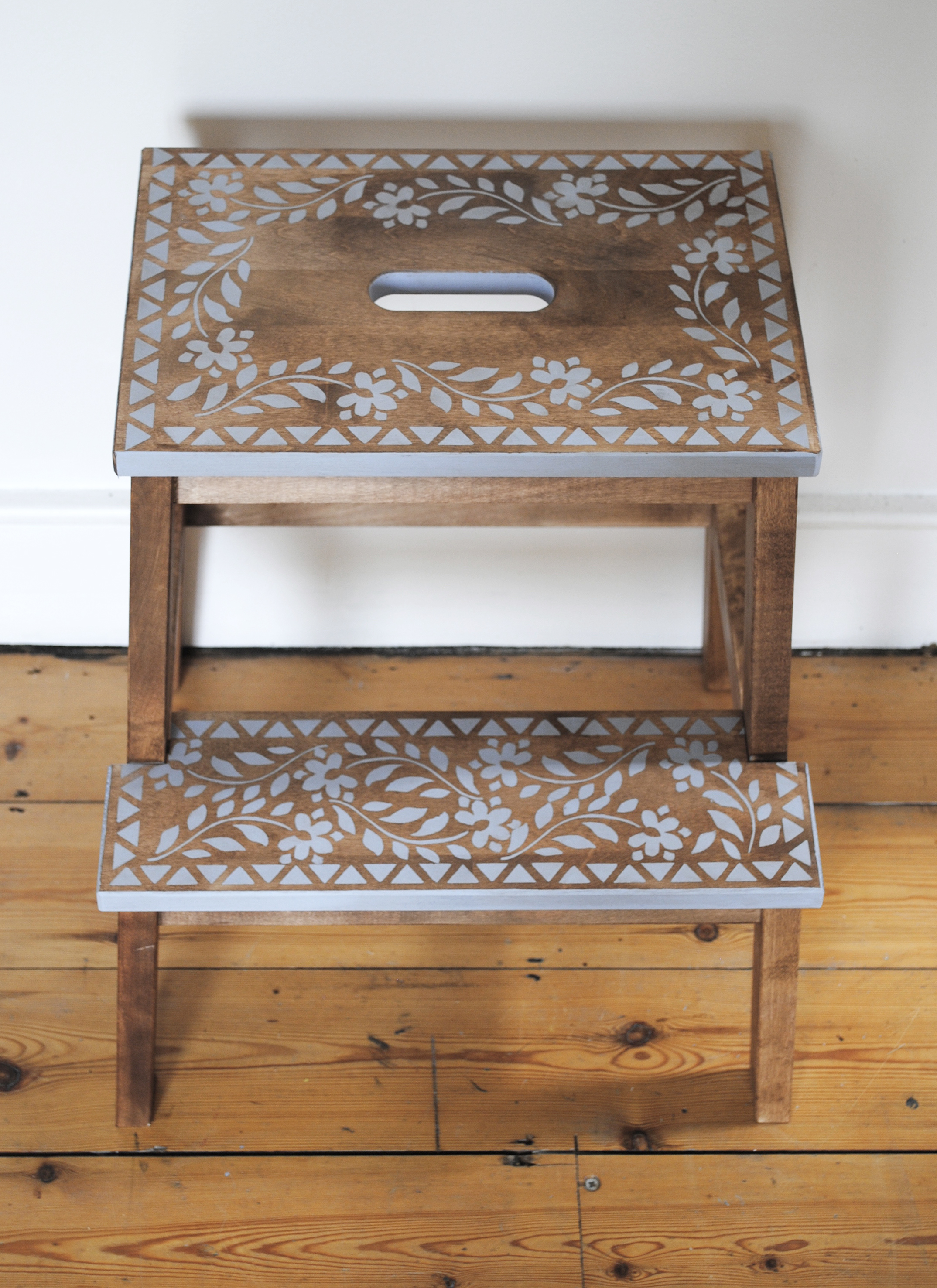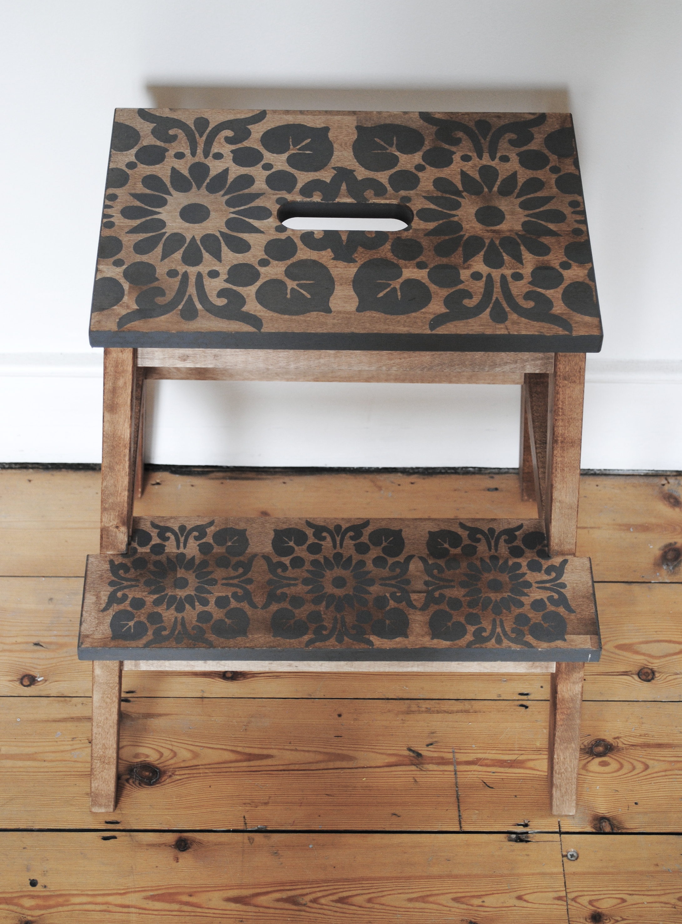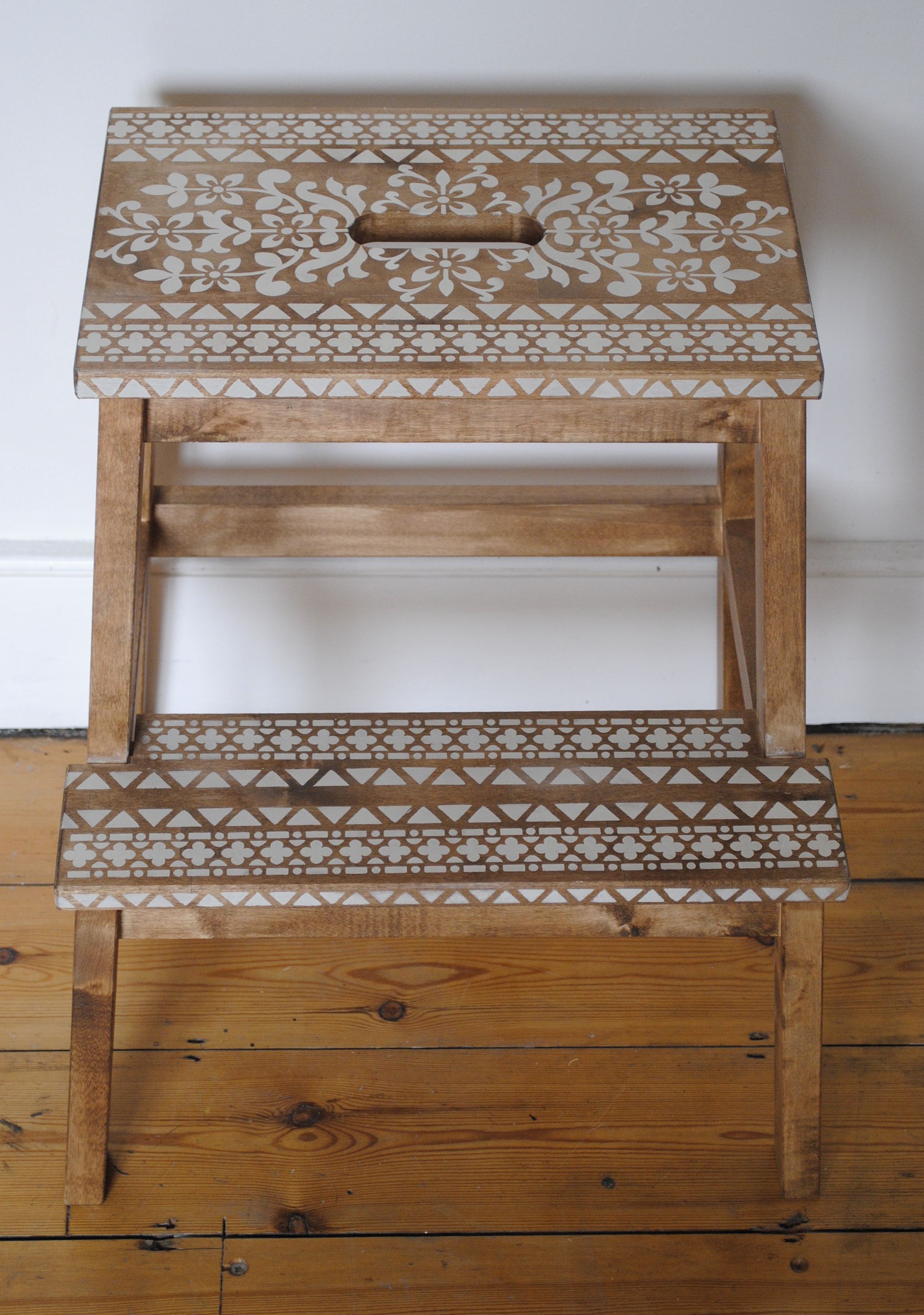 The stools are cheap and offer a perfect blank canvas to take pattern. Instead of painting the whole stool, I applied a dark wood stain using a cotton cloth, and then added the stencil designs. The sides of each of the steps were then painted in a solid colour adding weight and balance.