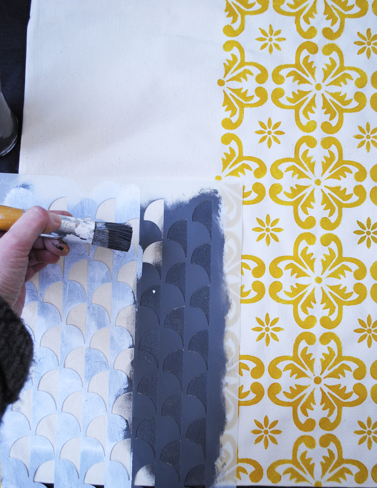- Using a circular motion apply the paint through the stencil, pushing down into the weave of the fabric.