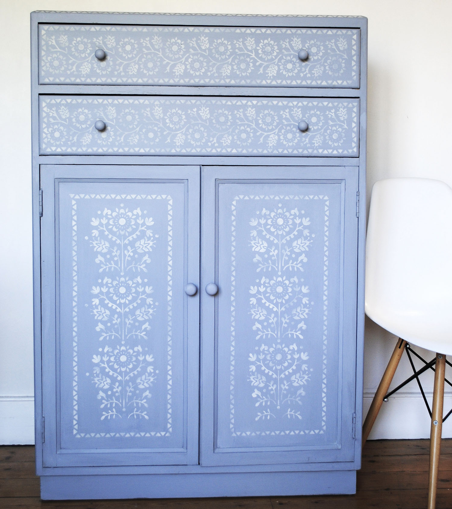 The cupboard was a little the worse for wear with stains and chipped veneers, so I decided to paint the whole thing, mixing a lovely greyed off pale blue colour. Before adding the pattern I painted the whole piece with a very matt varnish. The paint is then protected and any mistakes with the stencilling can be quickly wiped away with a damp cloth.