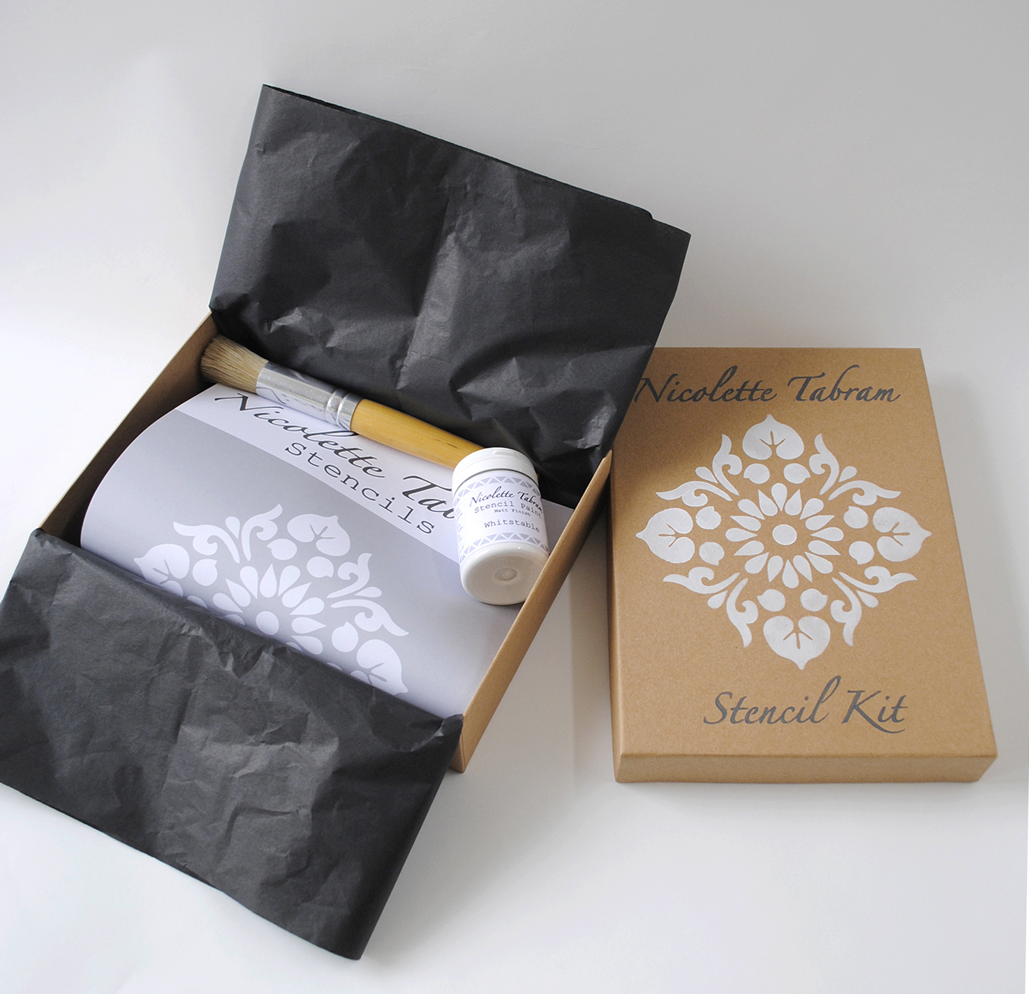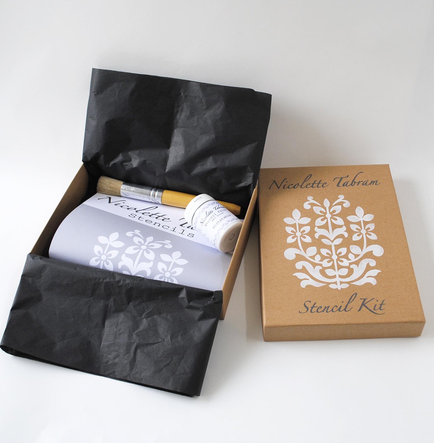 After ordering a lot of different samples of boxes, typically I chose the most expensive, because it is the most special and rather than have the lids printed, I have chosen to individually stencil each one, including the logo (nothing like being true to your brand!). Each kit contains a stencil, a brush and a pot of stencil paint. The brush and paint are wrapped in black tissue paper and there are illustrated tips on how to stencil and ideas for projects.