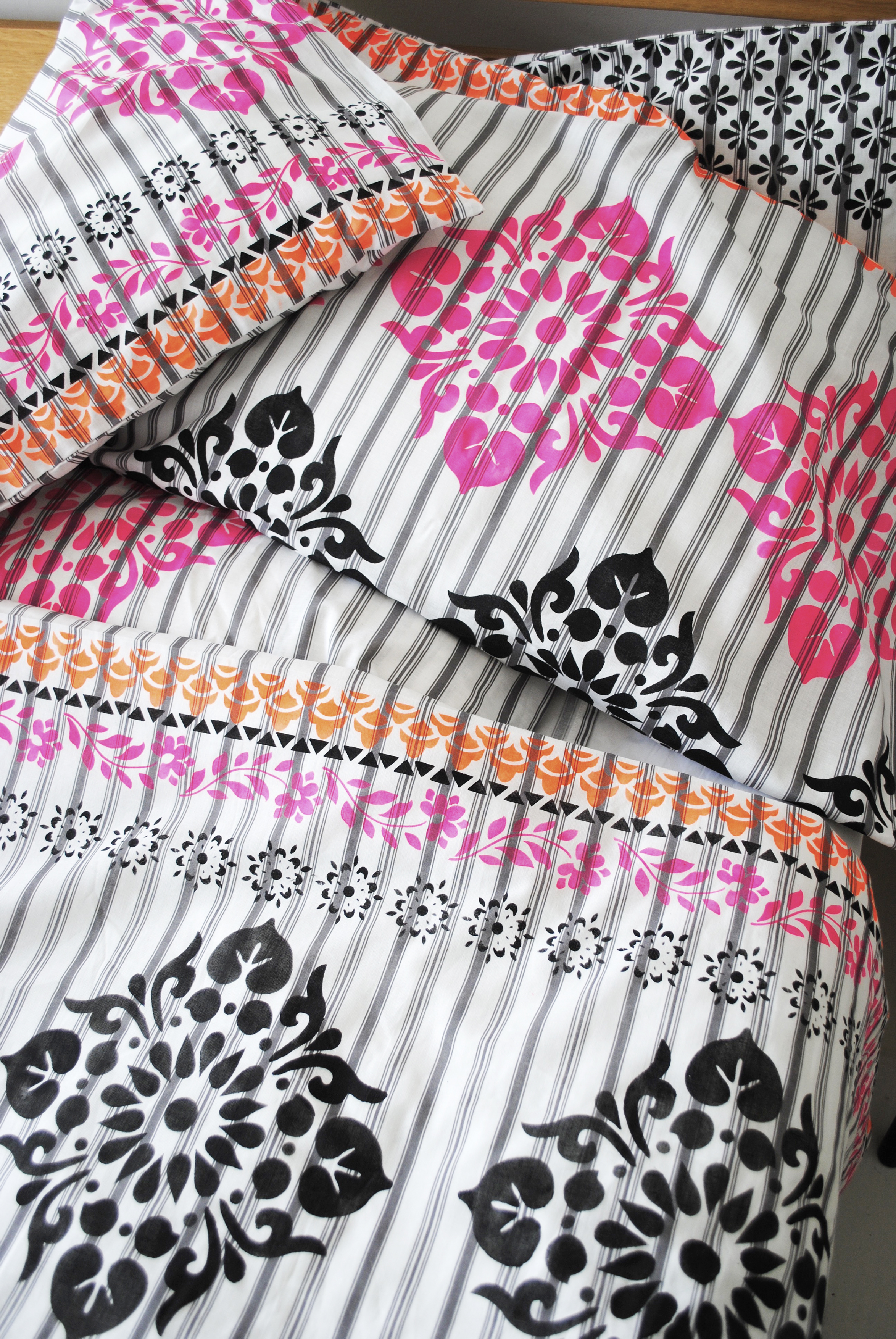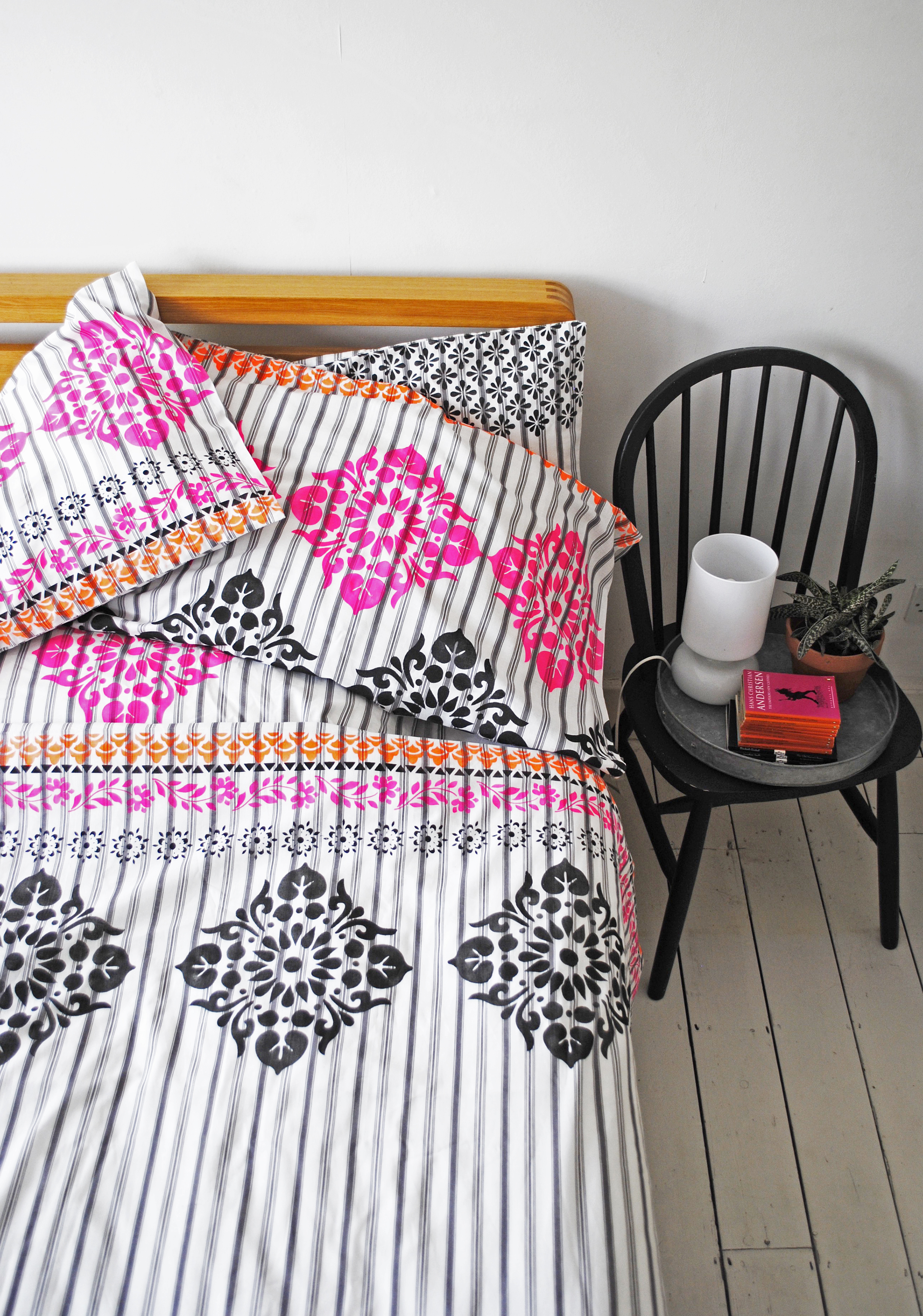 I actually used a new duvet set from IKEA which is made from a woven stripe cotton, but this is also a great way to update old bed linen and layering the stencil design on top of an existing print or stripe can create really interesting results.