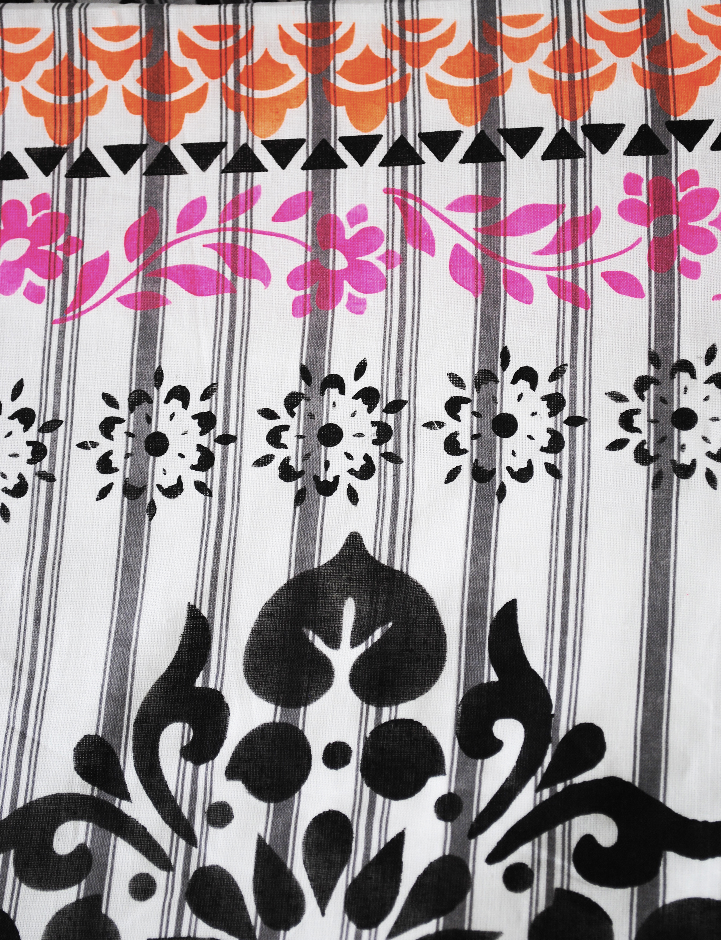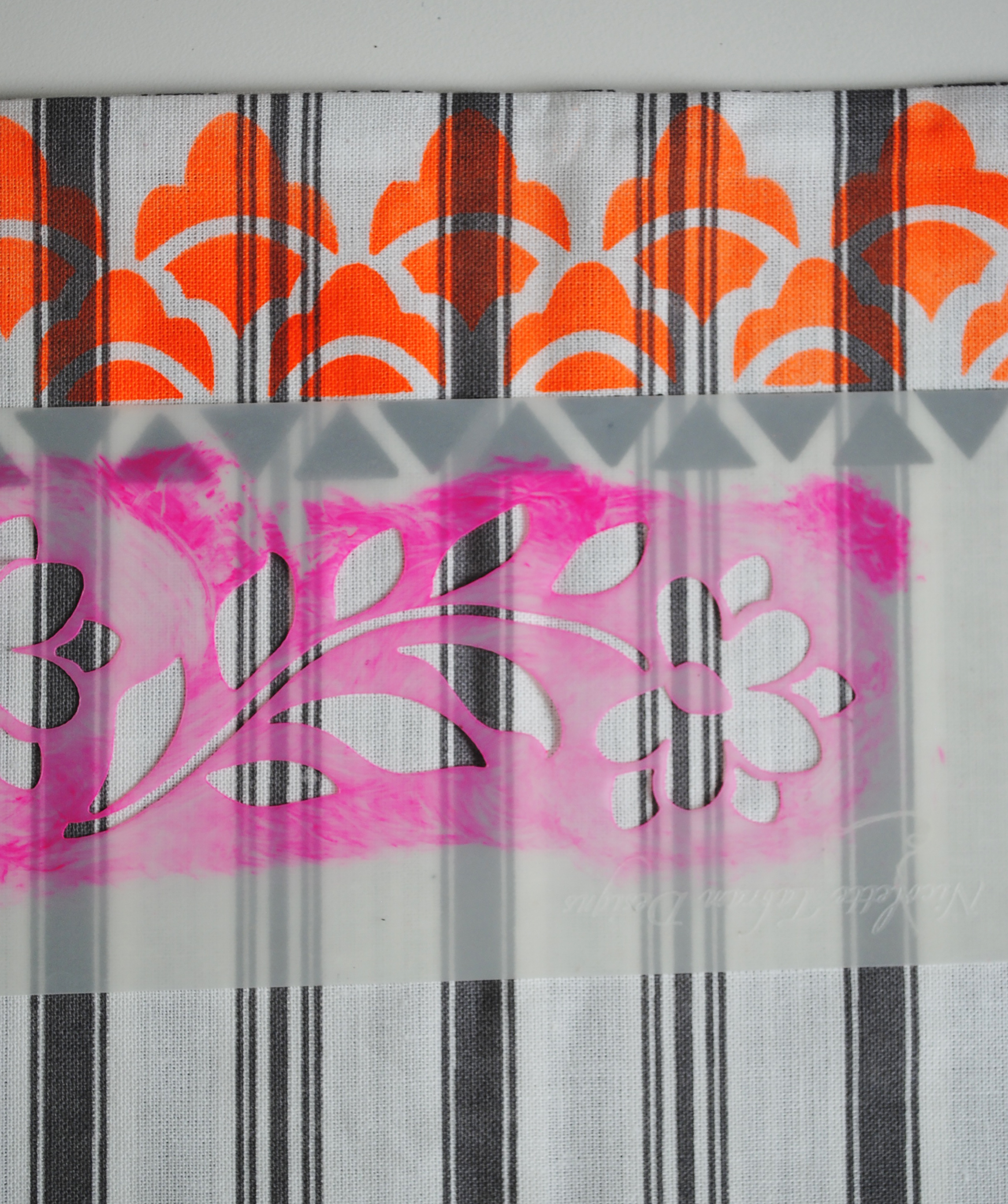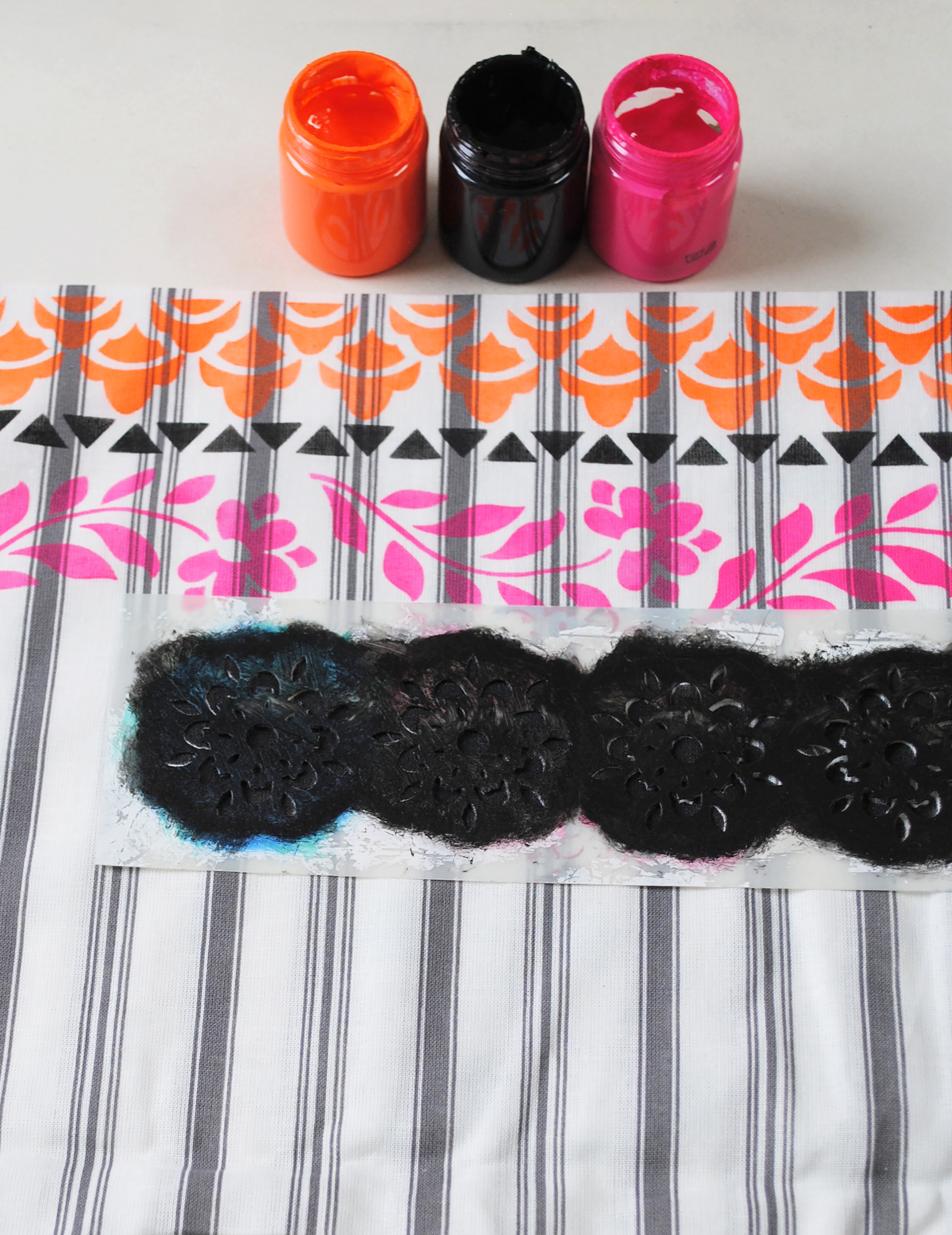 Once the design was complete, the stencil pattern was fixed using a hot iron, this makes it machine washable. Fabric paint usually has a binder in it which can make the fabric feel a bit crisp at first, but once washed, it will soften down beautifully.