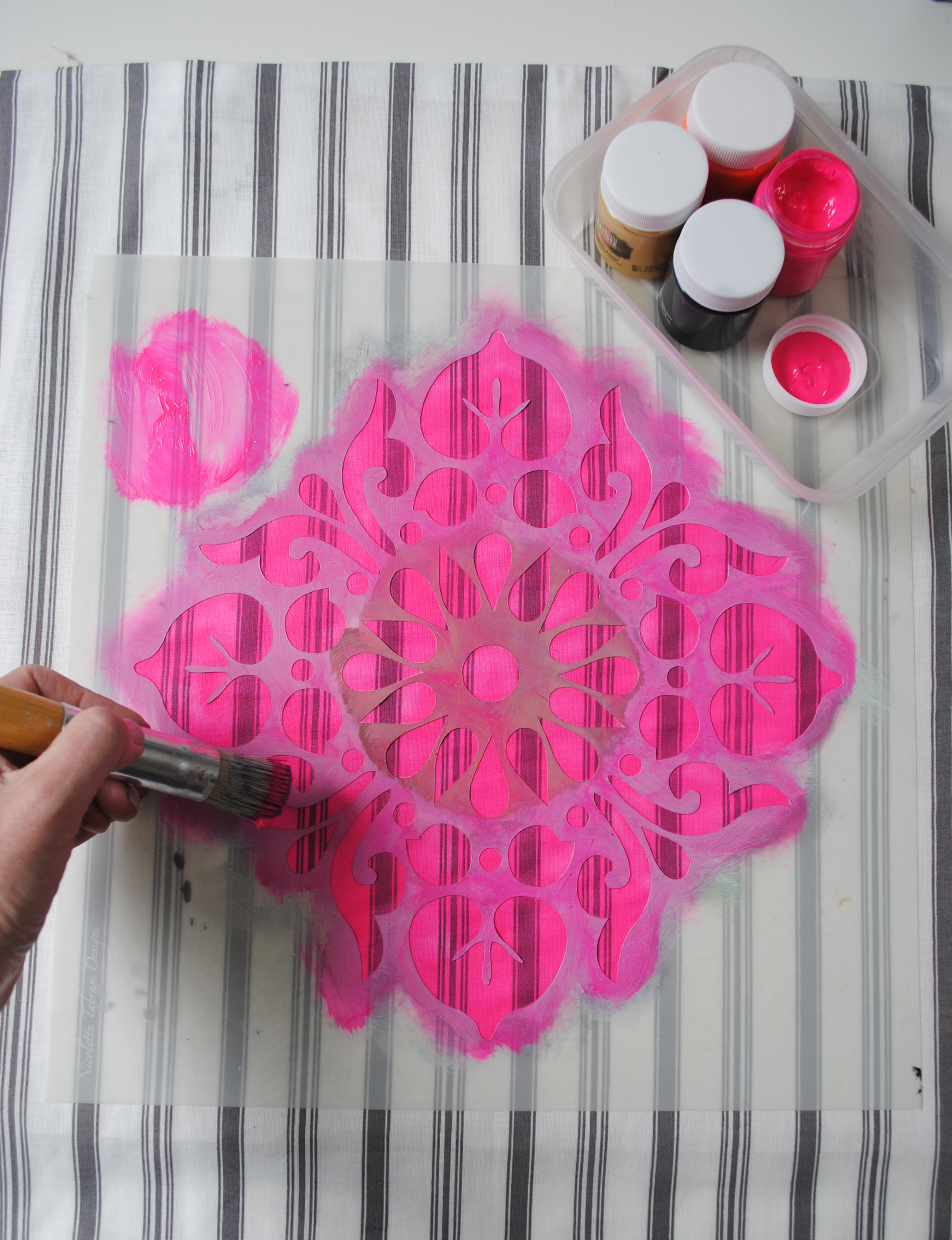 Anybody who has attended one of my furniture stencilling workshops will have heard me repeatedly telling people to remove as much paint as possible from the stencil brush, though when working on fabric, the brush needs to be loaded with slightly more paint.
