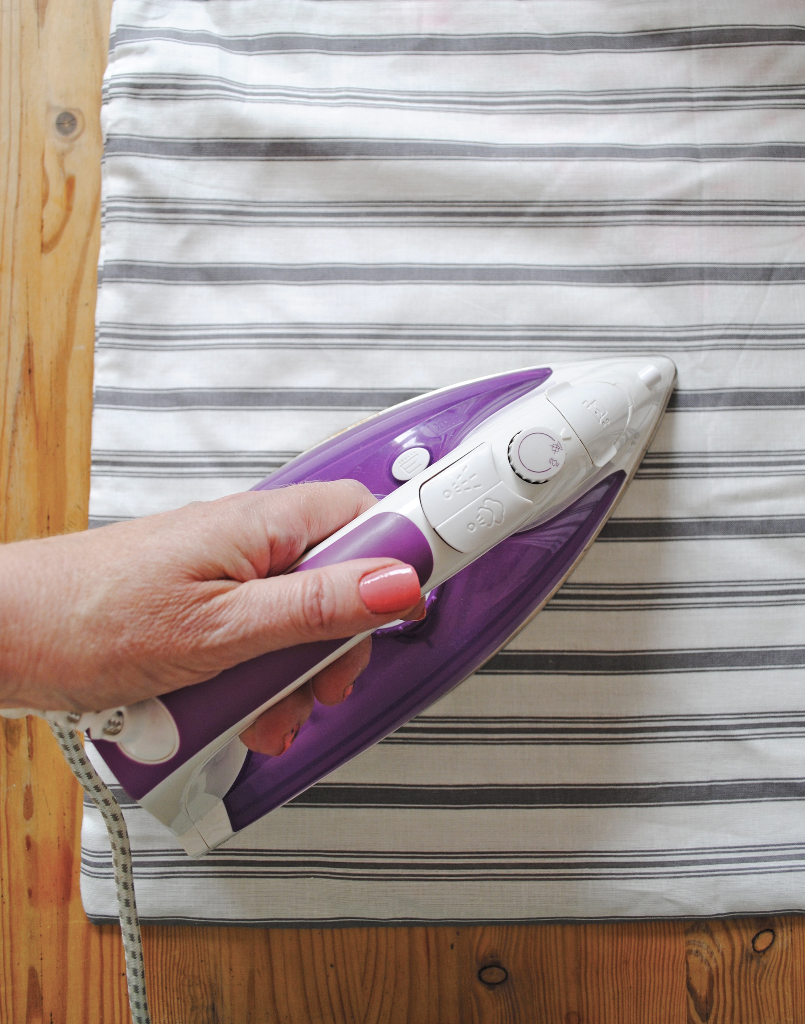 When stencilling fabric, the first step is to use an iron to create a nice flat surface on which to work. I would really recommend lightly coating the back of the stencil with a spray adhesive, so that it adheres evenly to the fabric. This will prevent the paint from bleeding underneath the stencil.